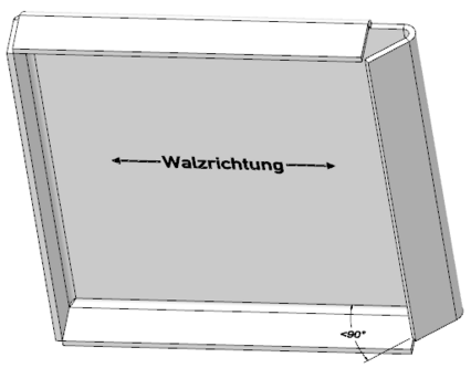 Abhängig von Material und Blechdicke kann es beim Abkanten zu einer Rissbildung auf der Außenseite des Biegeradius kommen. Um eine Rissbildung zu verringern oder vermeiden zu können sollten Sie eine Walzrichtung quer zur Biegelinie wählen. Wenn alle Seiten Ihres Blechteils Kantungen aufweisen sollten Sie die Seite wählen die einen Biegewinkel <90° hat.